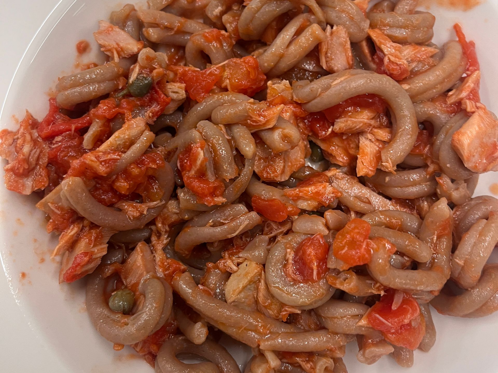 Caserecce Farro, Barbabietole e Vinacce Veggie Fledge con Tonno, Pomodoro, Capperi e Tabasco